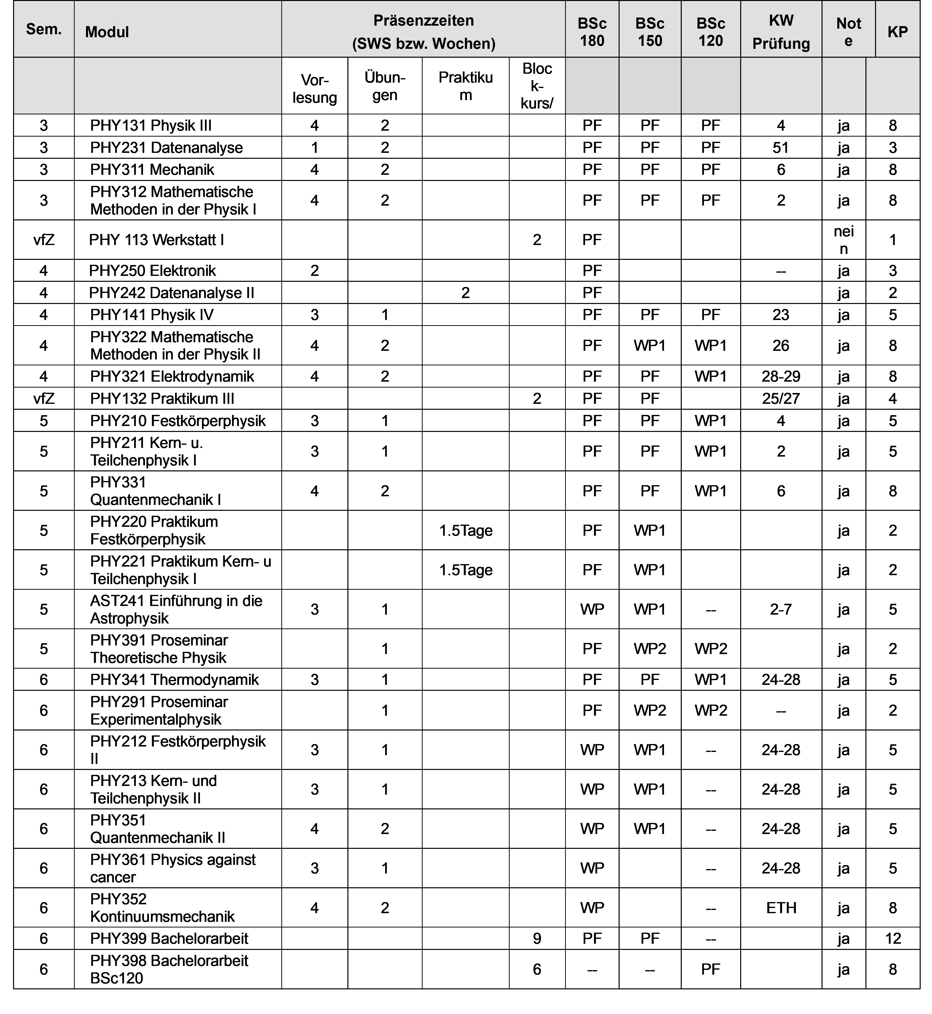 - Studierende, die Mathematik als Nebenfach gewählt haben, können PHY312 und PHY322 auch durch andere Mathematikvorlesungen ersetzen, wobei besonders Funktionentheorie empfohlen wird.